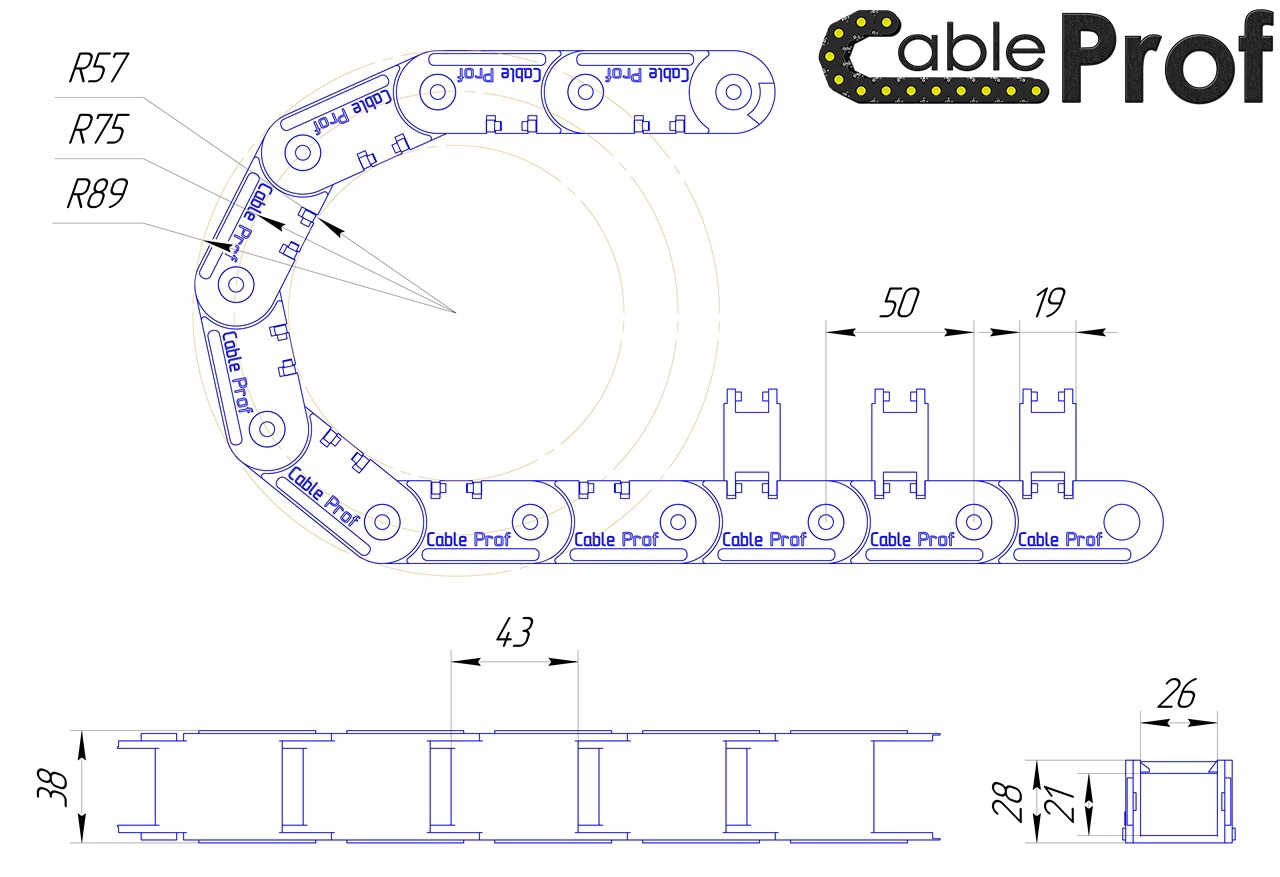 Кабелеукладчик, кабель-канал, кабельная цепь "Cableprof" 25*20 R55